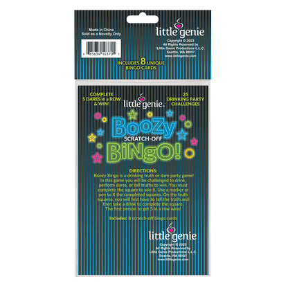 Boozy Bingo is a drinking truth-or-dare party game! In this game, you will be challenged to drink, perform dares, or tell truths to win. You must complete the square to win it. Use a marker or pen to X the finished squares. You must first tell the truth and then take a drink to complete the square. The first person to get five in a row wins! Included: 8 Bingo scratch-off cards.