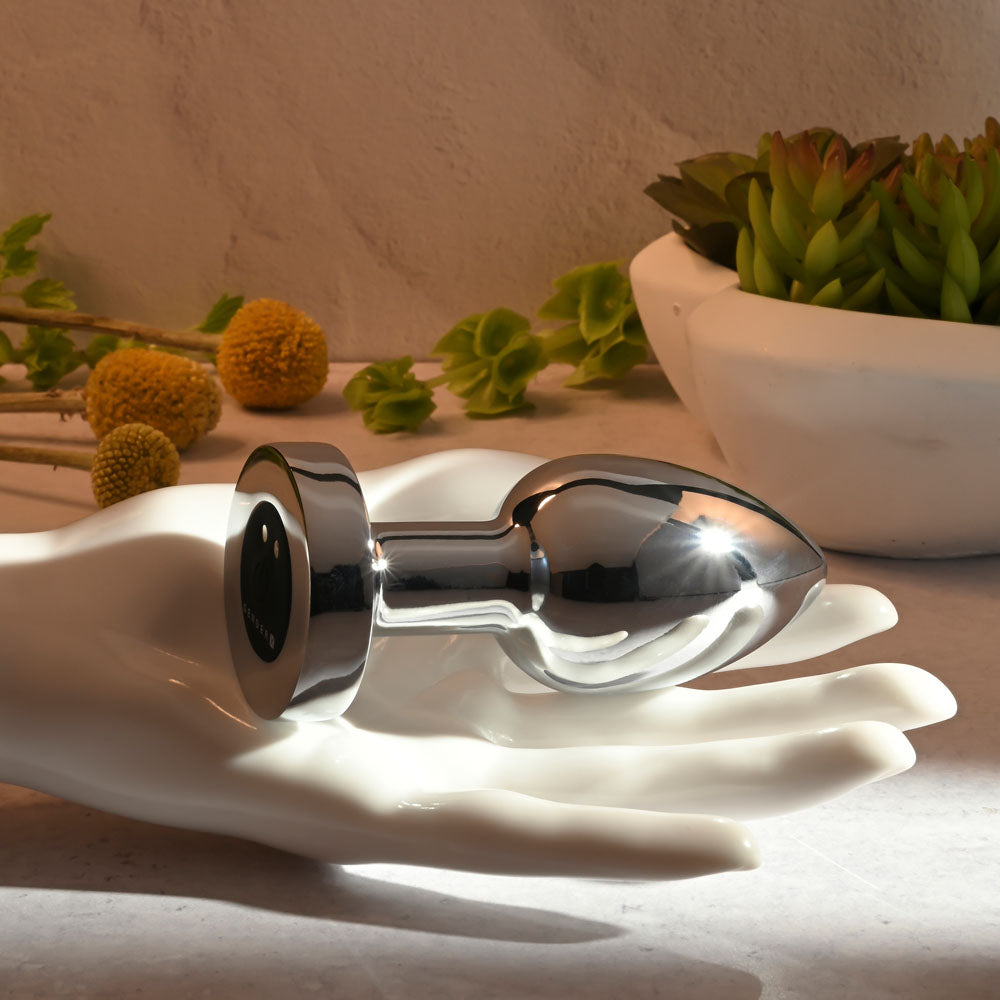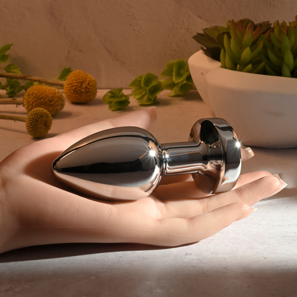 Rev up your body with this sleek metal plug designed for everybody! Tapered to an elegant tip, it buzzes and pulses in seven delicious speeds and functions for your customised pleasure. The lustrous nonporous surface slides on skin beautifully and lets you explore erogenous zones in whatever way you choose! Try immersing the plug in warm or cool water beforehand for fun sensation play. After all, it's completely submersible - and rechargeable too.